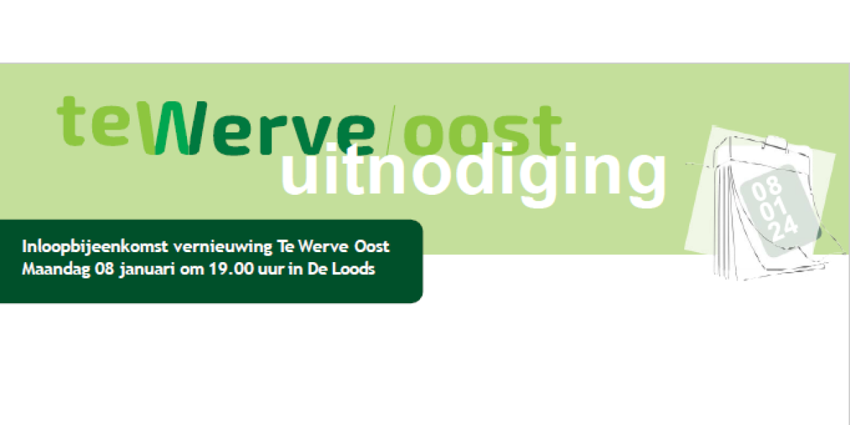 Het bestemmingsplan voor Te Werve Oost ligt ter inzage. Op 8 januari 2024 is er een inloopbijeenkomst in De Loods. Hier kunt u langskomen als u vragen heeft over het bestemmingsplan.